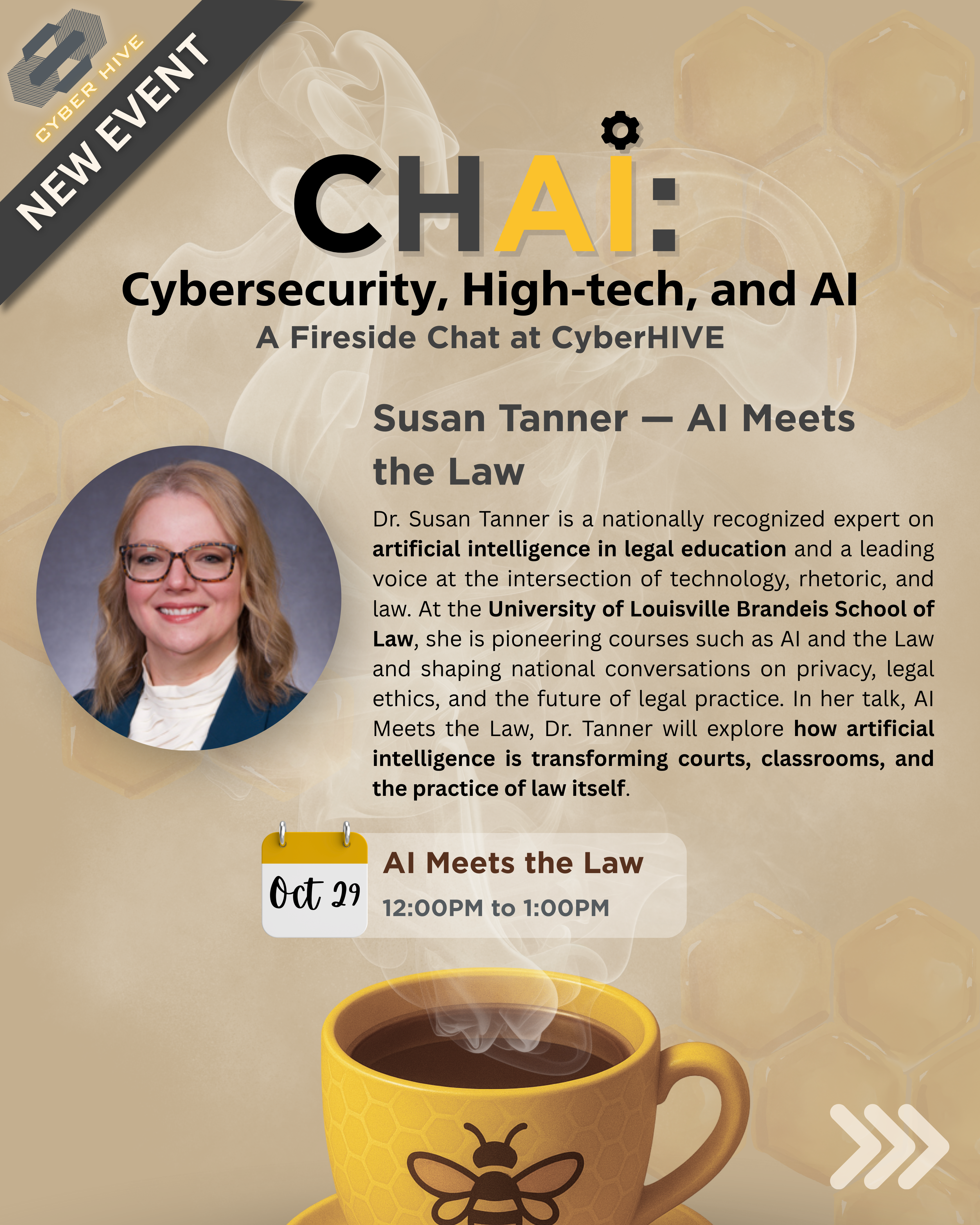Dr. Susan Tanner is a nationally recognized expert on artificial intelligence in legal education and a leading voice at the intersection of technology, rhetoric, and law. At the University of Louisville Brandeis School of Law, she is pioneering courses such as AI and the Law and shaping national conversations on privacy, legal ethics, and the future of legal practice. In her talk, AI Meets the Law, Dr. Tanner exploreed how artificial intelligence is transforming courts, classrooms, and the practice of law itself.