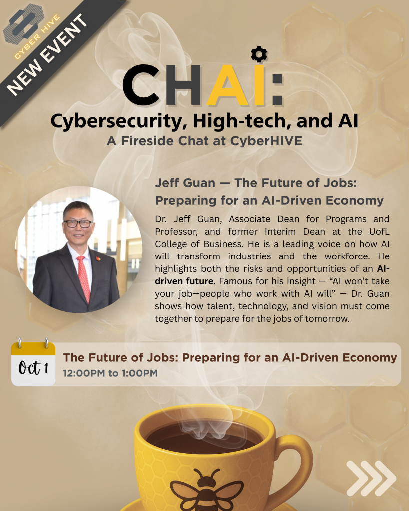Dr. Jeff Guan, Associate Dean for Programs and Professor, and former Interim Dean at the UofL College of Business. He is a leading voice on how AI will transform industries and the workforce. He highlighted both the risks and opportunities of an AI-driven future. Famous for his insight, “AI won’t take your job, people who work with AI will.” Dr. Guan showed how talent, technology, and vision must come together to prepare for the jobs of tomorrow.